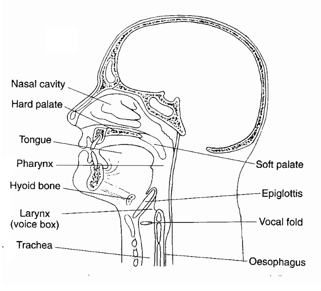 Compared to chimpanzees, two major differences float to the surface. First, the chimpanzee jaw juts out compared to the human. Second, because of how low the trachea is in humans, the pharynx in the human is proportionately much longer than that of the chimpanzee’s. Together, the short pharynx and jutted out face allow the chimpanzee epiglottis a greater margin of error than a human’s epiglottis.